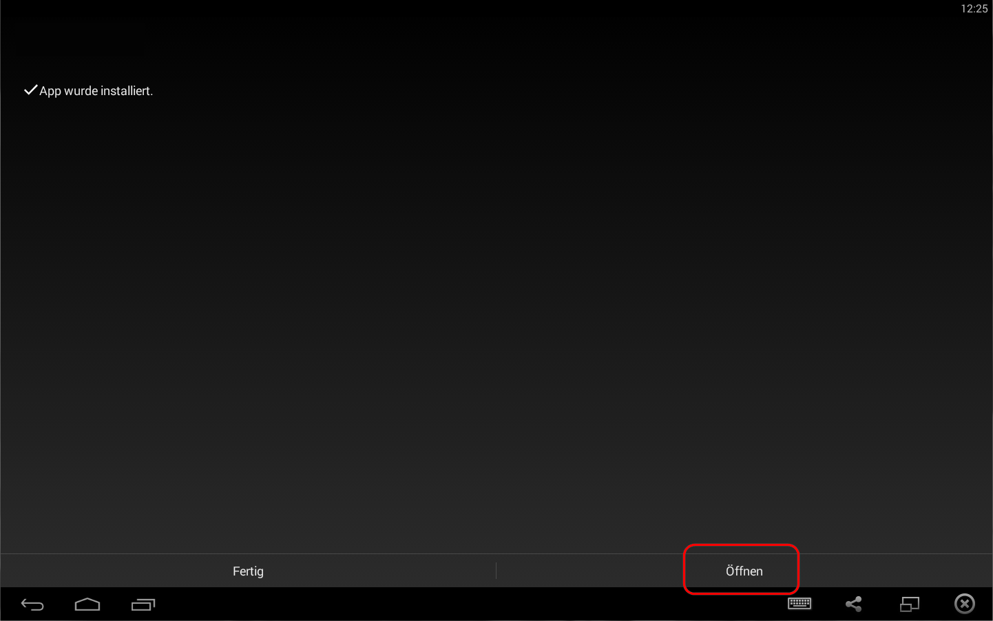 Nach Abschluss der Installation erscheint das Dialogfenster App installiert. Tippen Sie in diesem Fenster auf → Öffnen um den für eine Verbindung zur Cloud notwendigen Aktivierungscode zu erhalten.