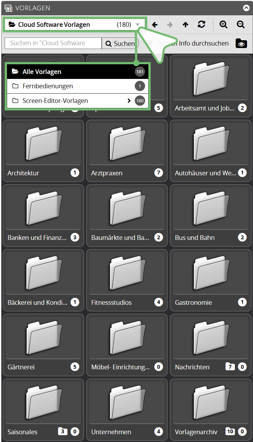Der Klick auf die Leiste Vorlagen gibt Ihnen einen Schnellzugriff auf den Vorlagen Bereich, den Sie regulär über die Schaltfläche Screens auf der Startseite erreichen. Dieser Bereich stellt Ihnen eine Auswahl bereits gefertigter Vorlagen zur Verfügung. Das Drop Down Menü bietet die Darstellungsoptionen
