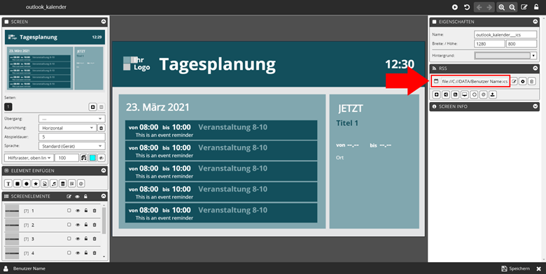 - Öffnen Sie unter → Quelle das Menü und wählen den von Ihnen gespeicherten Kalenderlink aus.