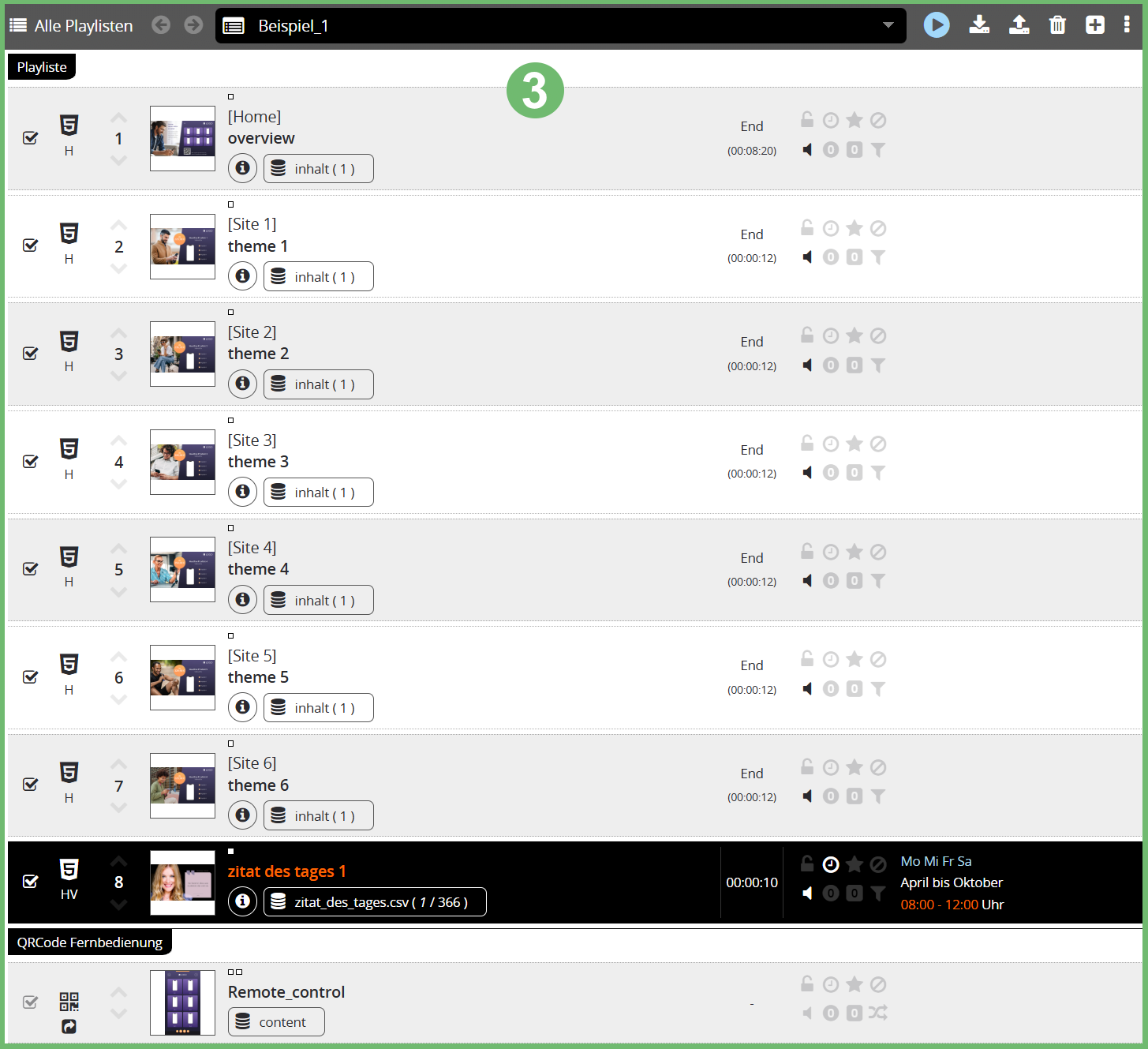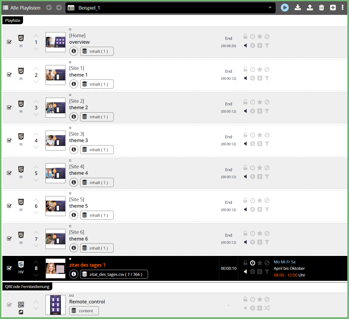 In einer erstellten Playliste werden alle eingefügten Inhalte als Elemente mit einer eigenen Zeile im Playlisten-Bereich gelistet.
