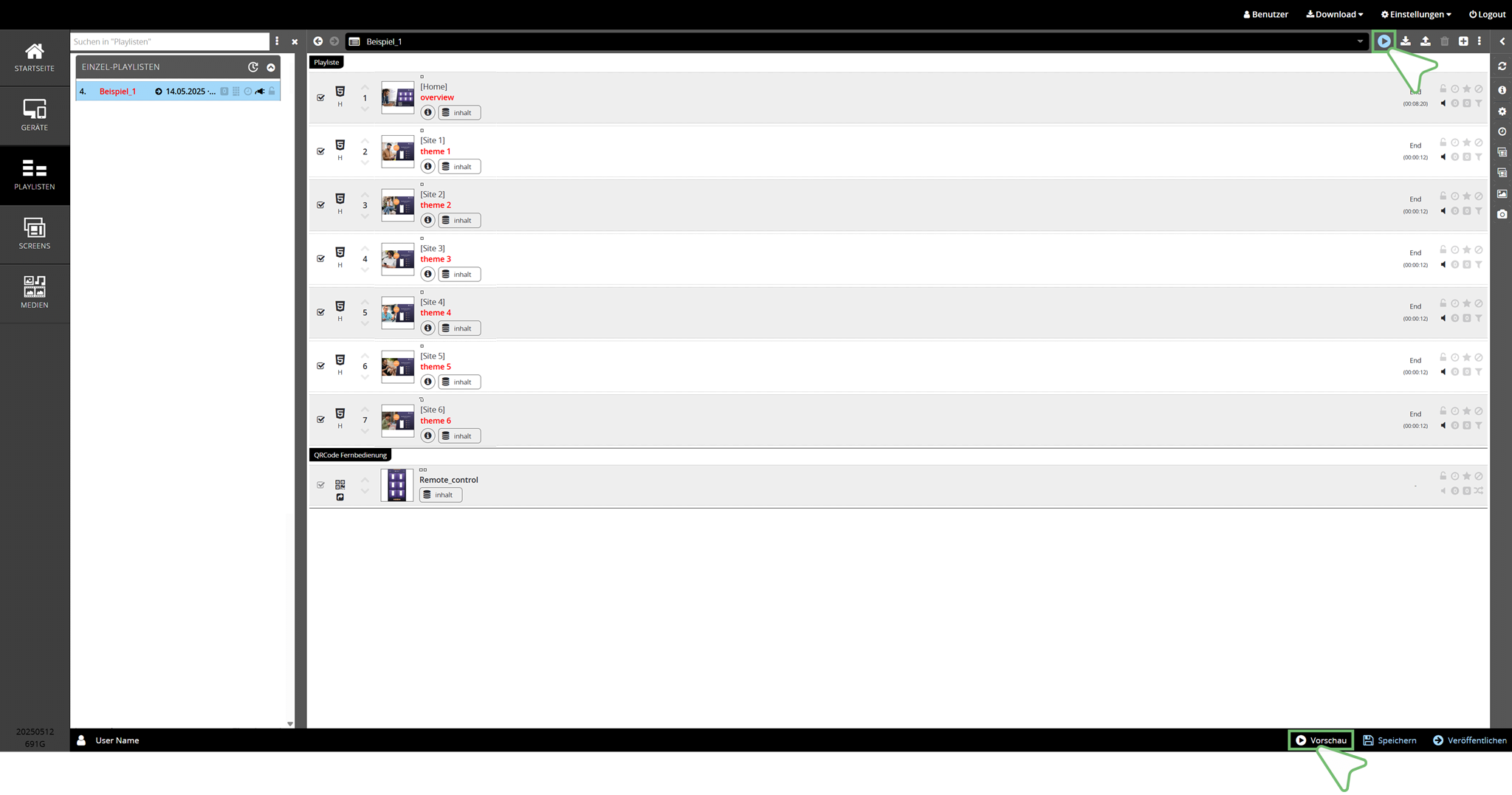 Die Playlistenvorschau öffnen Sie durch den Klick auf das Play-Symbol in der oberen Leiste oder durch Klick auf die Vorschau Funktion rechts unten in der Leiste.