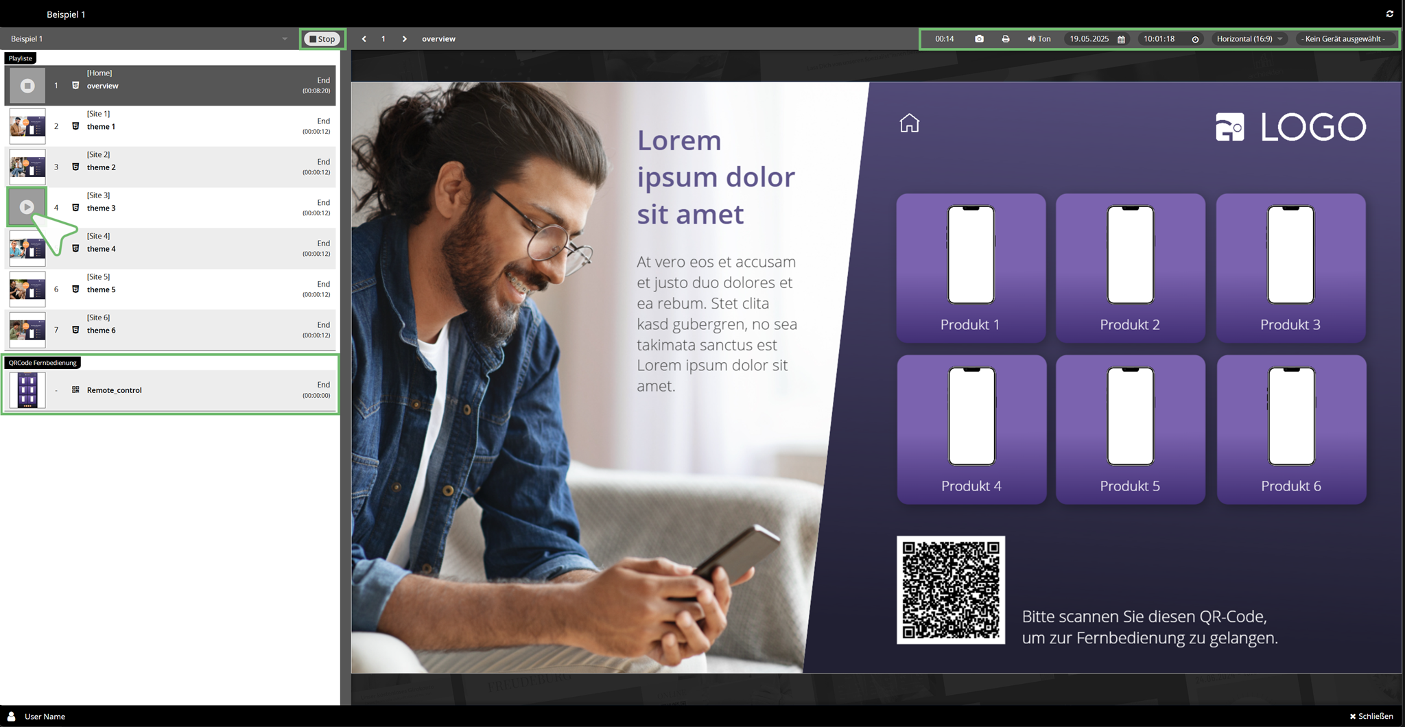 Zudem können Sie in der Playlistenvorschau auch Overlay-Elemente und Fernbedienungen sehen und deren Funktionalität ebenfalls in der Vorschau nachstellen.