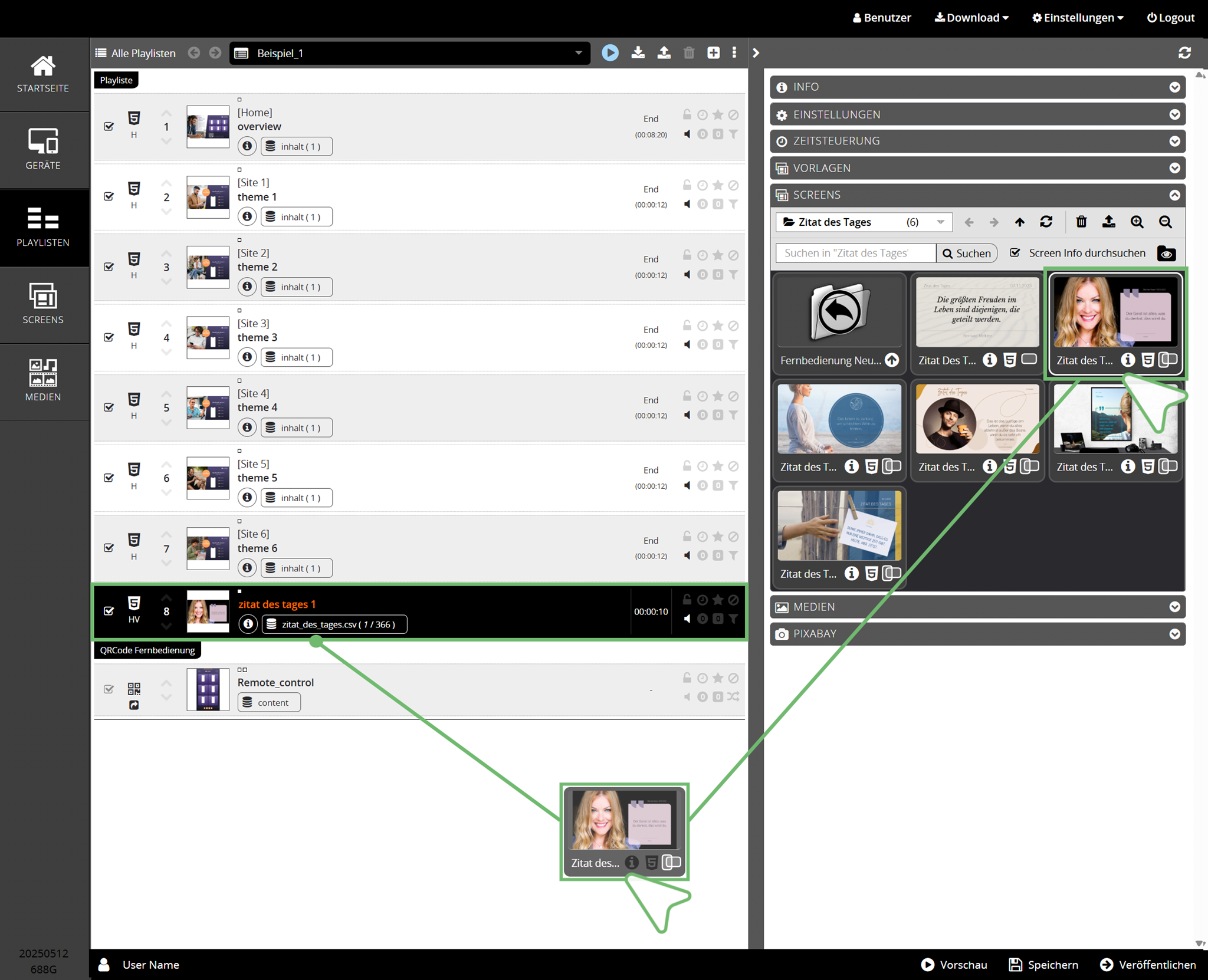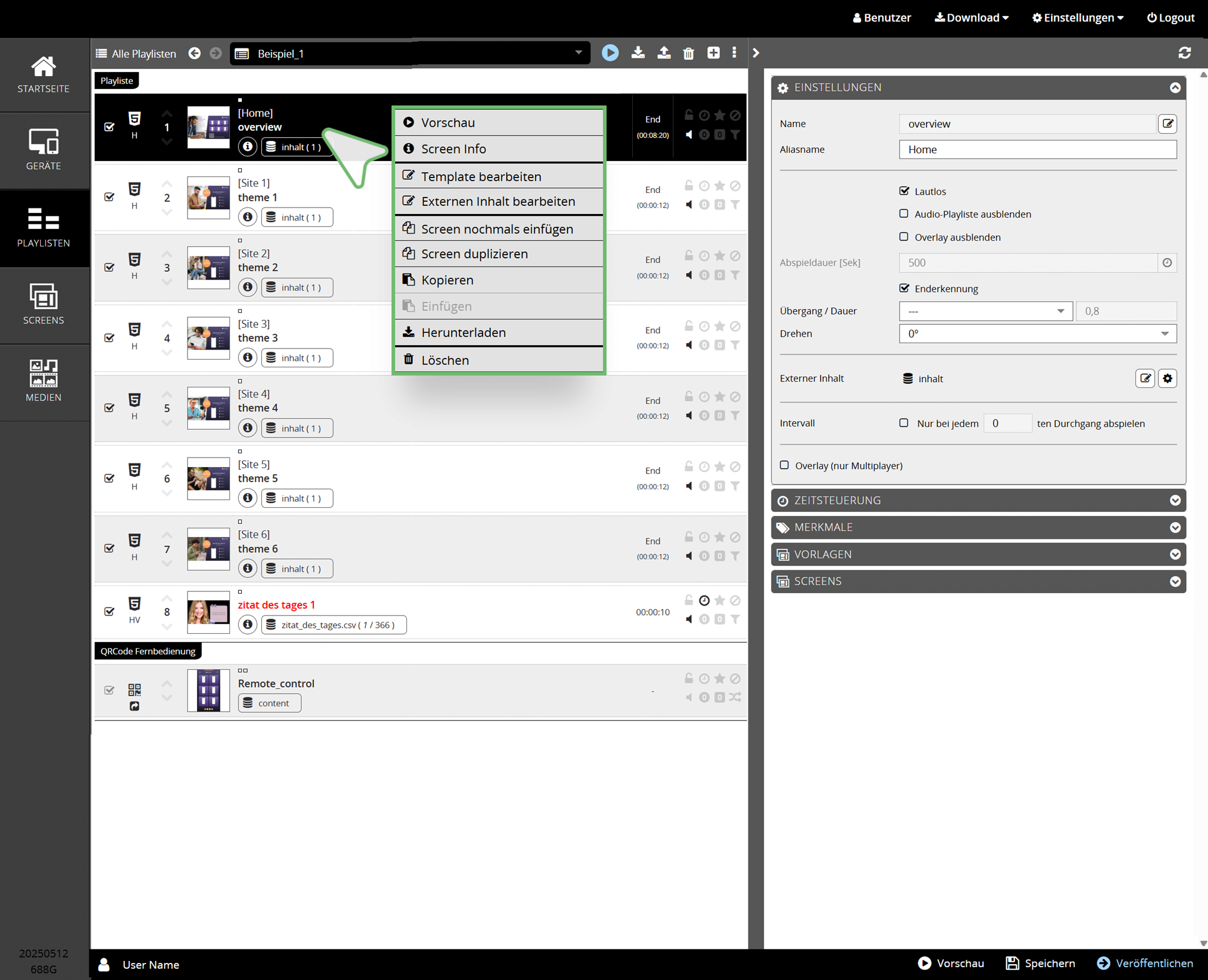 Sie können die Bereiche Vorlagen und Meine Screens über die rechte Spalte aufrufen und daraus einen Screen per Drag & Drop an jede gewünschte Position in Ihre Playliste ziehen. Ein Rechtsklick auf das gerade eingefügte Element und folgendem Klick auf → Template bearbeiten ermöglicht Ihnen individuelle Anpassungen.