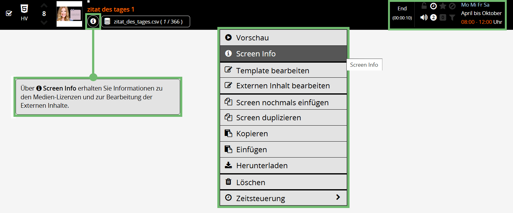 Das → i-Symbol unter dem Namen eines Playlistenelements verweist auf wichtige Nutzerhinweise, wie Lizenzhinweise zur Nutzung von Drittanbieter Medien oder Bearbeitungshinweise zu externen Inhalten unter Screen Info.
