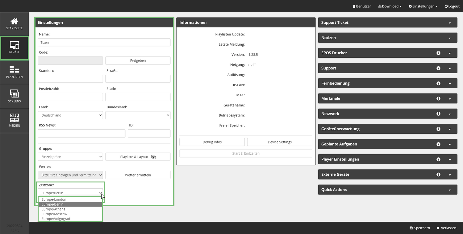 Die Zeiteinstellung in der Cloud Software ist wichtig für die Zeitsteuerung der Playlisten und insbesondere für die automatische Umstellung der Sommer- und Winterzeit auf Grundlage der Zeitzone.