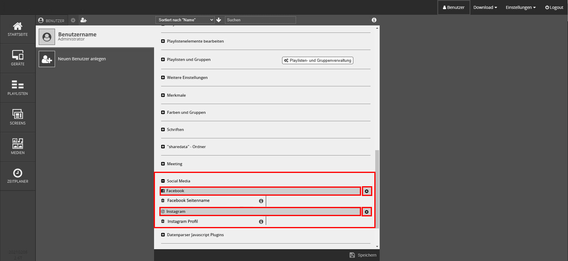 Sie haben die Möglichkeit in der Benutzerverwaltung dem aufgerufenen Benutzer die sozialen Medien Facebook und Instagram langfristig hinzuzufügen.
