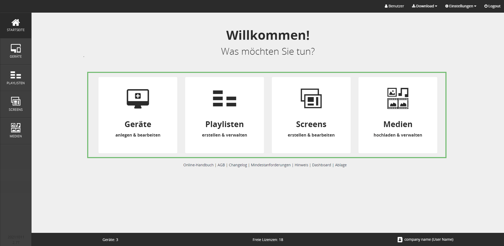 Die vier Hauptbereiche Geräte - Playlisten - Screens und Medien sind als Schaltflächen in der Mitte der Oberfläche angelegt: