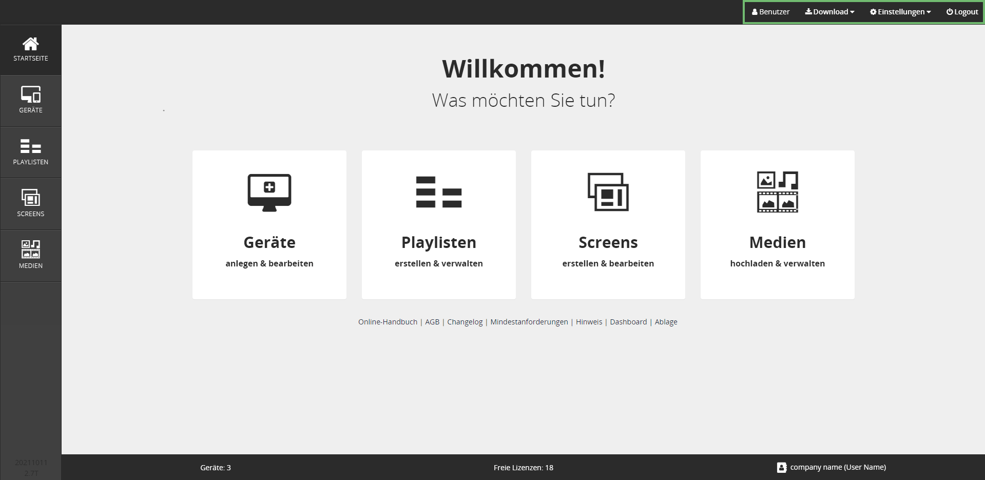 Die vier Hauptbereiche Geräte - Playlisten - Screens und Medien sind in sinnvoller Reihenfolge als Schaltflächen in der Mitte der Oberfläche angelegt.