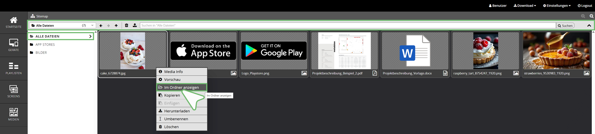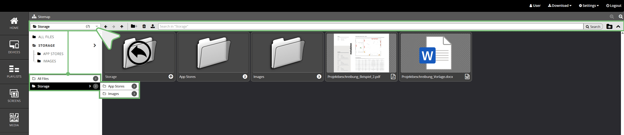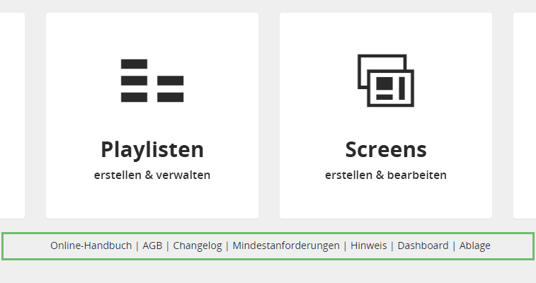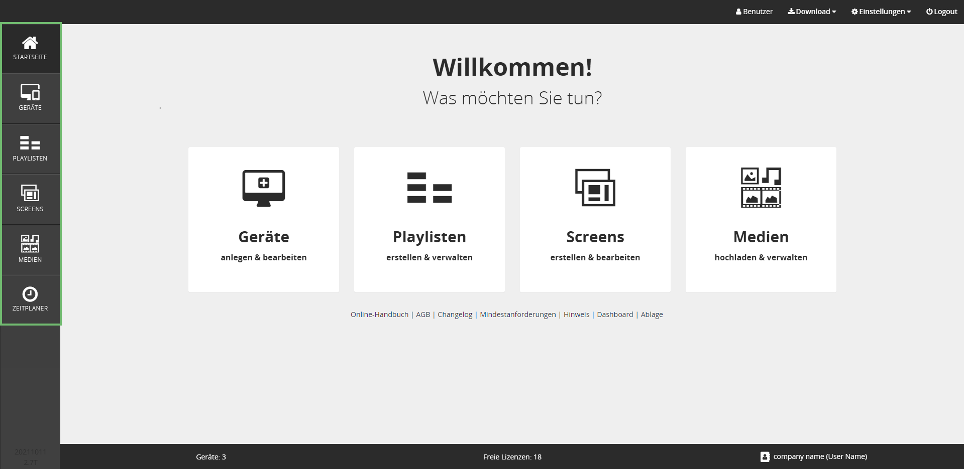STARTSEITE - GERÄTE - PLAYLISTEN - SCREENS - MEDIEN - ZEITPLANER