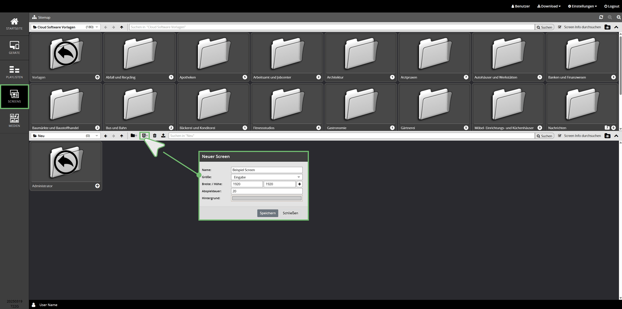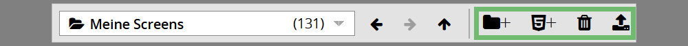 Der Klick auf die Schaltfläche Screens bringt Sie zum umfangreichen Vorlagen Pool mit einer Fülle von vorgefertigten Vorlagen im oberen Bereich und zum benutzerdefinierbaren Bereich Meine Screens. Dort können Sie individuell bearbeitete Vorlagen für sich oder Ihre Unterbenutzer speichern. Dafür finden Sie Funktionen zum Erstellen/Löschen von Ordnern und Screens oder zum Hochladen auf einen anderen Computer/Server.