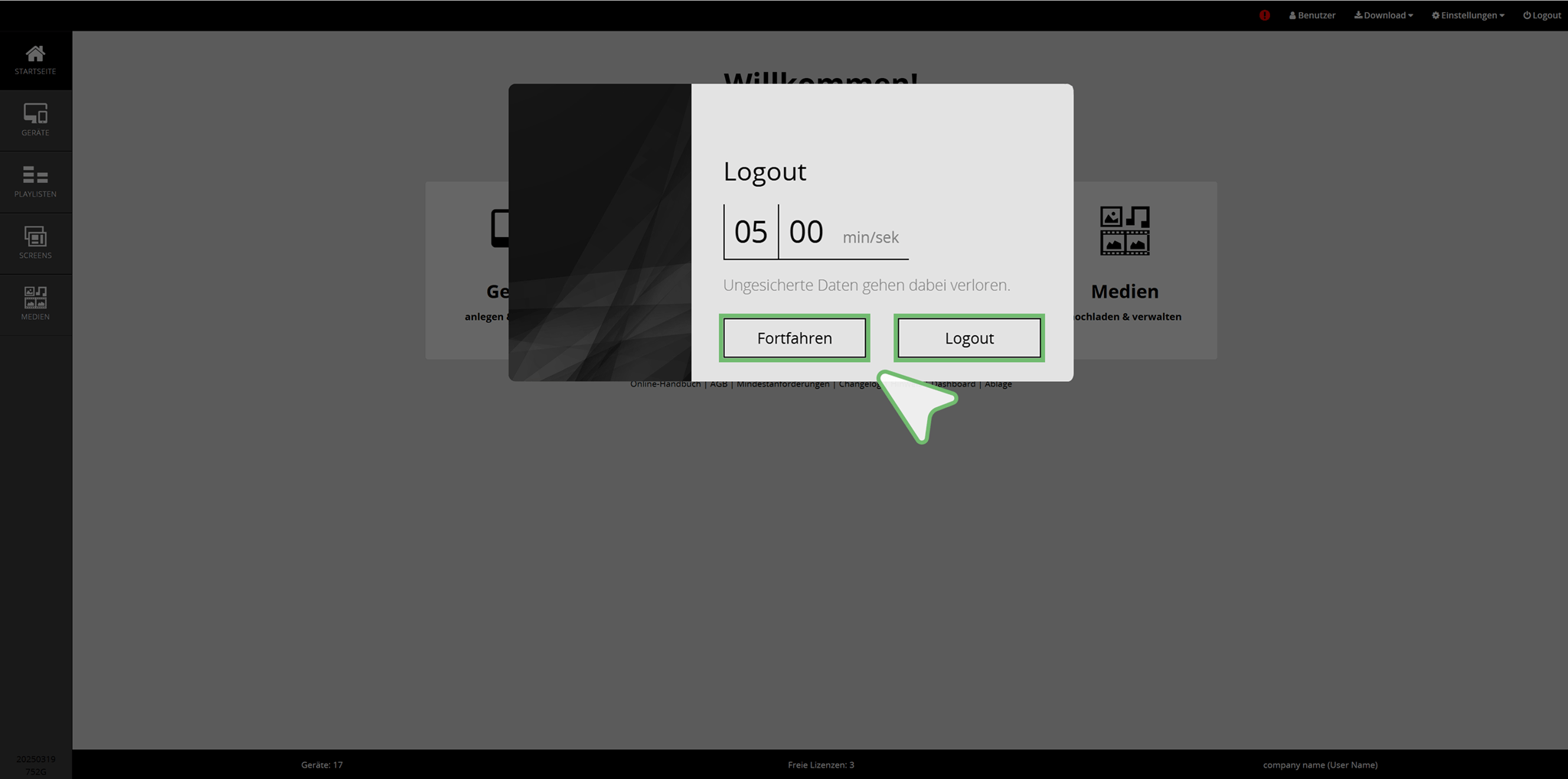 Es öffnet sich eine auf 5 Minuten begrenzte Popup Meldung. Diese fragt, ob Sie im Programm weiterarbeiten (→ Fortfahren) oder das Programm beenden (→ Logout) möchten.