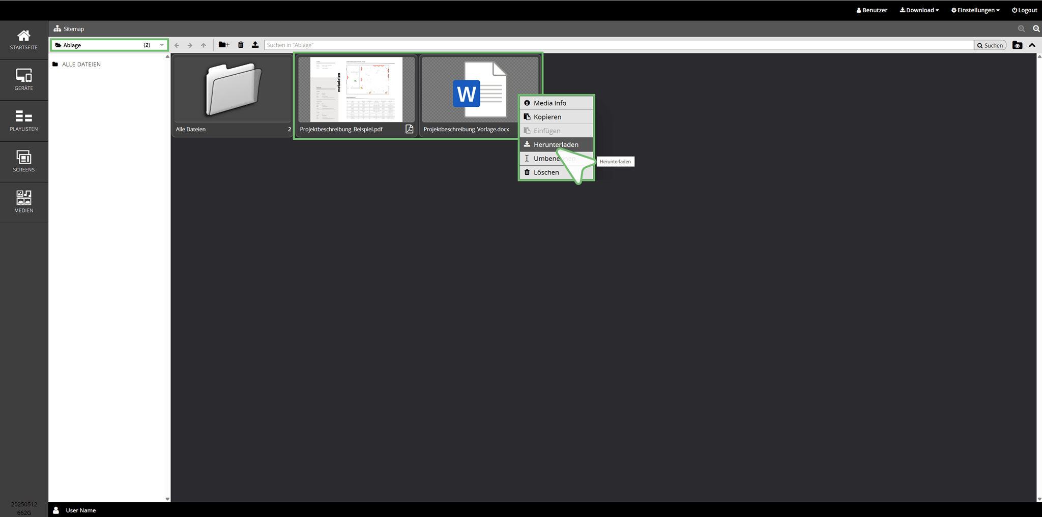 Ablage → Stellt alle Inhalte des Ablagebereichs, wie Dateien und Ordner, dar. In dieser Ansicht können über die Leiste neue Ordner angelegt, Dateien und Ordner hochgeladen oder gelöscht werden.