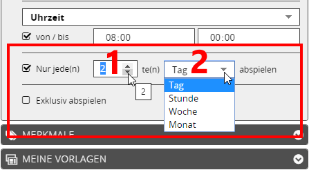Im ersten Feld können Sie nach Klick die Häufigkeit des Abspielens direkt festlegen oder die Pfeile dafür verwenden. Im zweiten Feld können Sie mit Hilfe einer Auswahlliste bestimmen, ob diese Häufigkeit sich auf die Stunde, den Tag, die Woche oder den Monat bezieht.