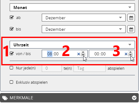 Sie haben die Zeiteinheit Uhrzeit gewählt. Klicken Sie in das Kästchen vor von/bis, damit Sie die Uhrzeiten festlegen können → 1. Im ersten Feld können Sie nach Klick die Uhrzeit für den Beginn der Abspielzeit direkt überschreiben oder die Pfeile ver- wenden → 2. Genauso bestimmen Sie im zweiten Feld das Ende der Abspielzeit → 3.